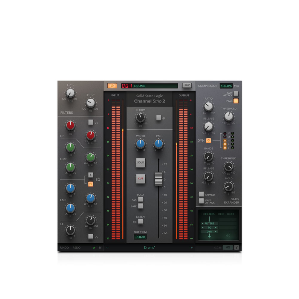 The SSL Channel Strip 2 plug-in delivers the legendary tone, features and workflow inspired by channel strips such as the SSL 9000 K, featuring SSL's proprietary EQ 'Anti-Cramping' technology and external side chain input. The latest Channel Strip 2 update (v2) welcomes the addition of a new Output Section with dedicated Fader Level, Width and Pan controls, plus advanced DAW Solo and Cut integration for Ableton Live, Studio One and REAPER (VST3 only).